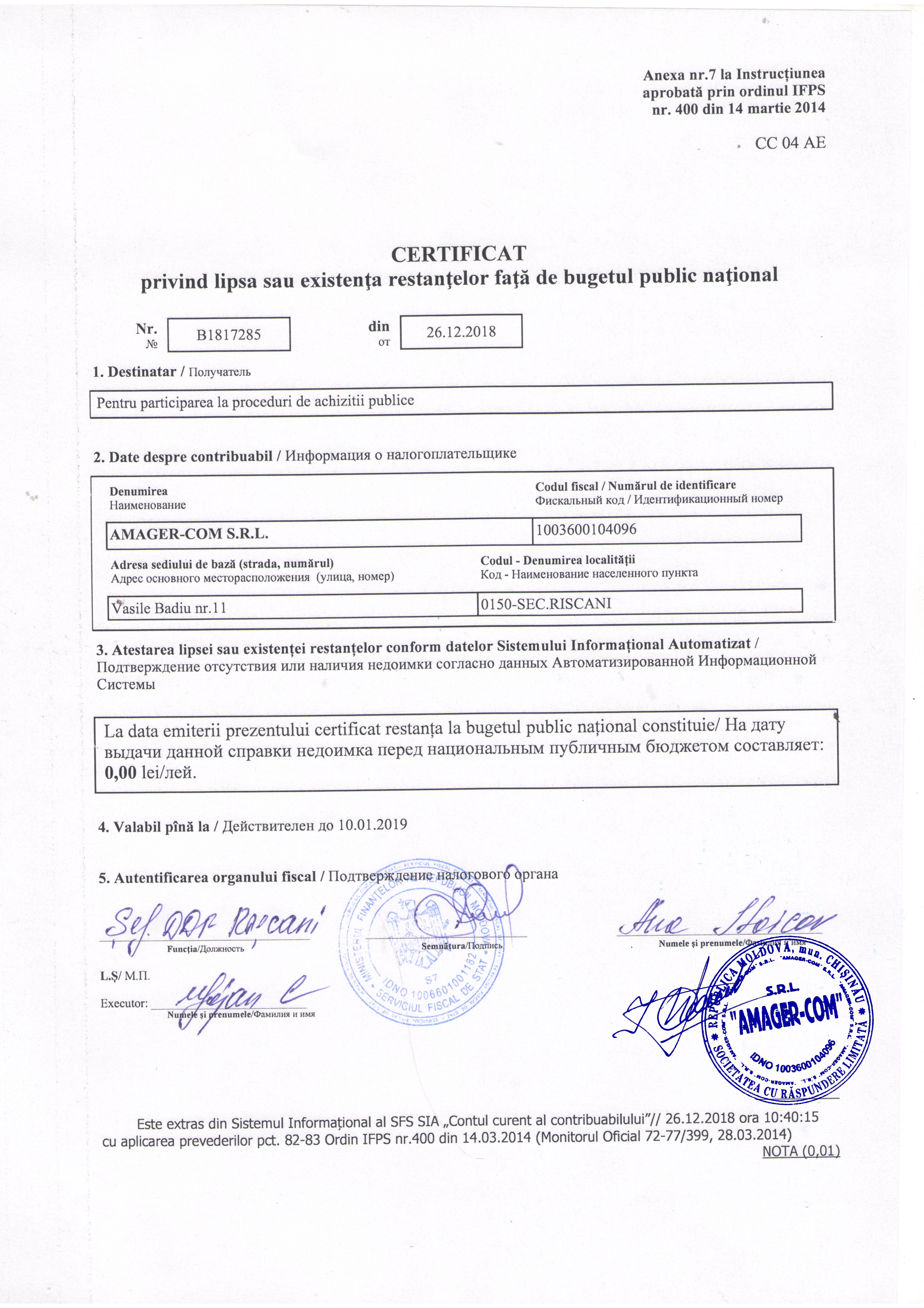 | 10/01/2019 11:00 | certificat fisc 10.01.2019.jpg | Doc. de calificare | Produse lectate | | Romana |