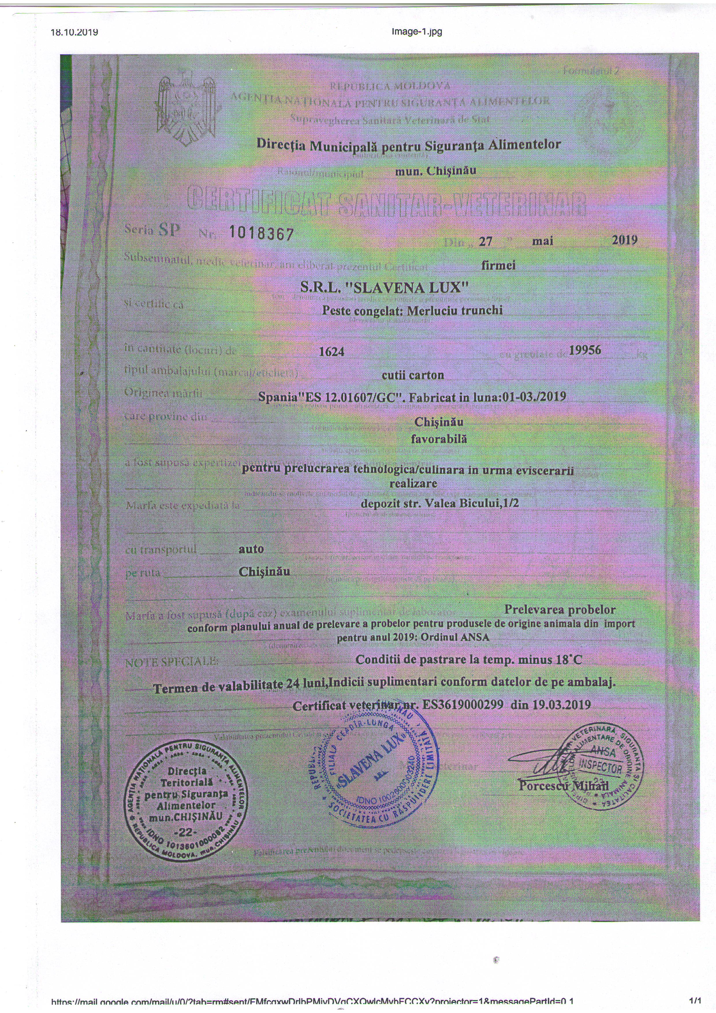 | 16/12/2019 13:38 | certificat.17,12,2019подписан.pdf | Doc. de eligibilitate (DUAE) | Замороженная рыба | | Romana |