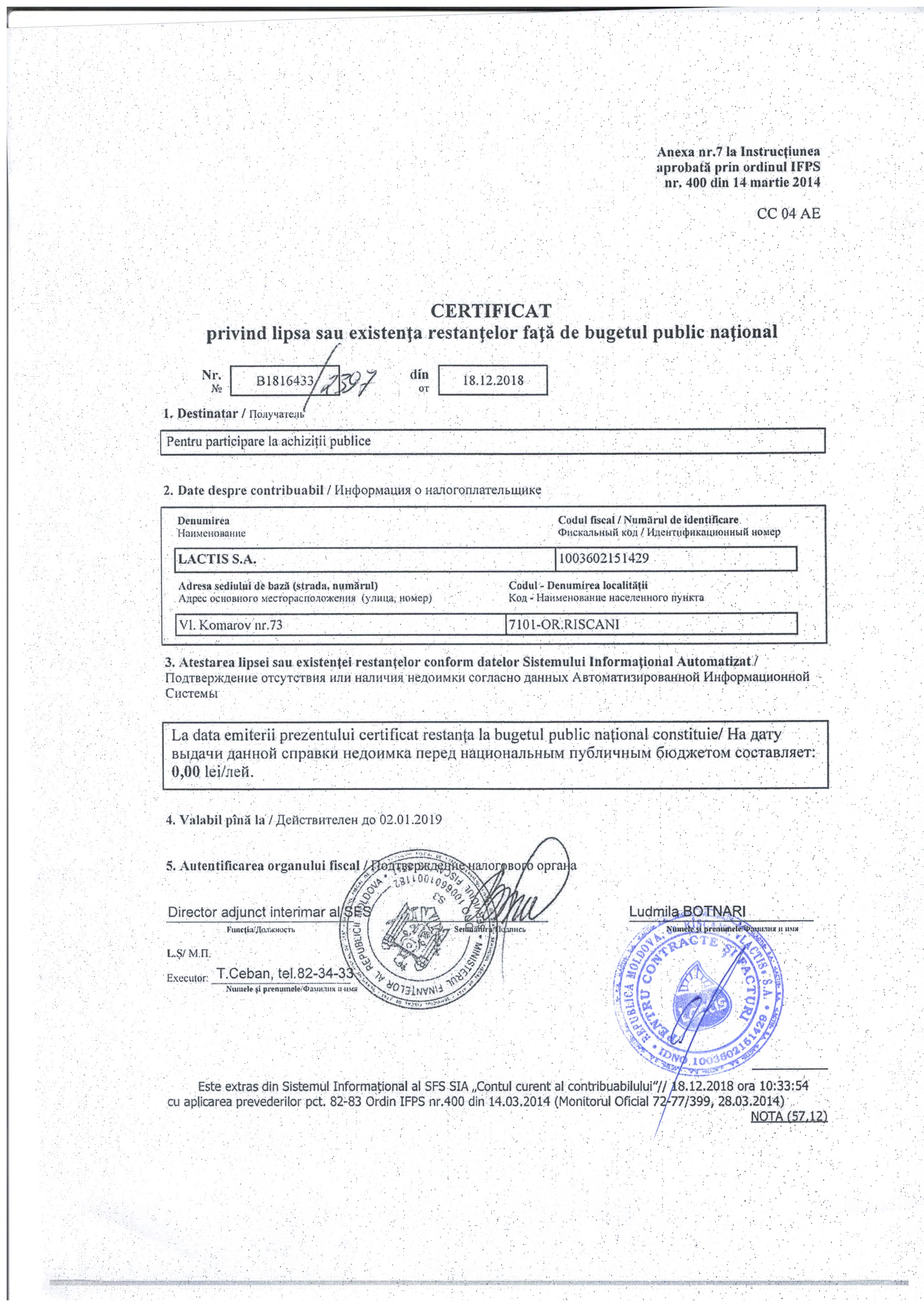 | 20/12/2018 00:00 | certificat de efectuare sistematică a plății impozitelor.jpg | Garanții | Lapte de vaci | Certificat de efectuare sistematică a plății impozitelor | Romana |