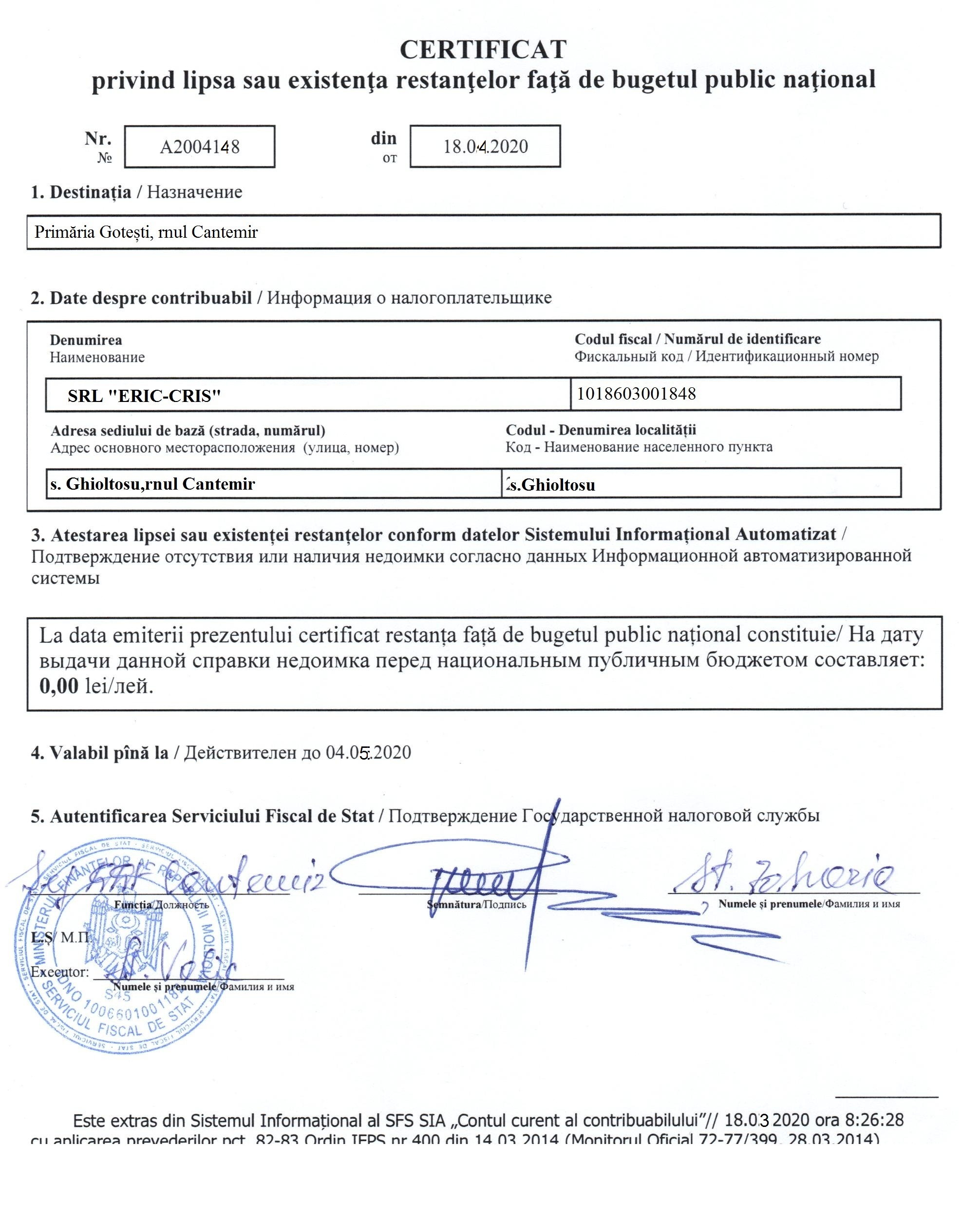 | 30/04/2020 18:30 | certificat fisc.jpg | Garanții | Schimbarea acoperisului la Gradinita de copii nr.4 din com.Gotesti r.Cantemir | | Romana |