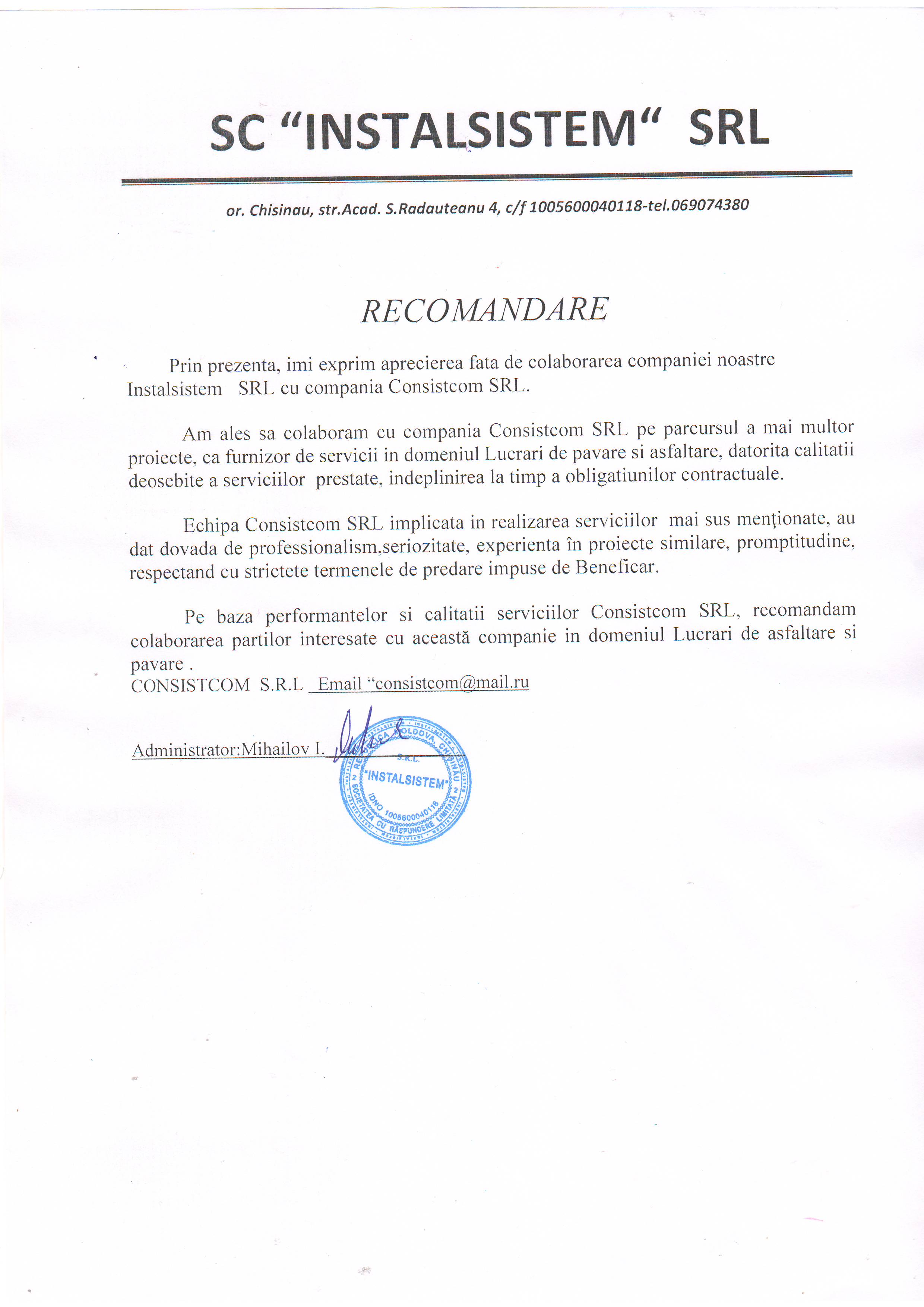 | 08/11/2018 14:00 | recomandare.jpg | Garanții | Asfaltarea suprafețelor și executarea a două piste de alergare | recomandari la contractele pt demonstrarea lucrarilor similare | Romana |
