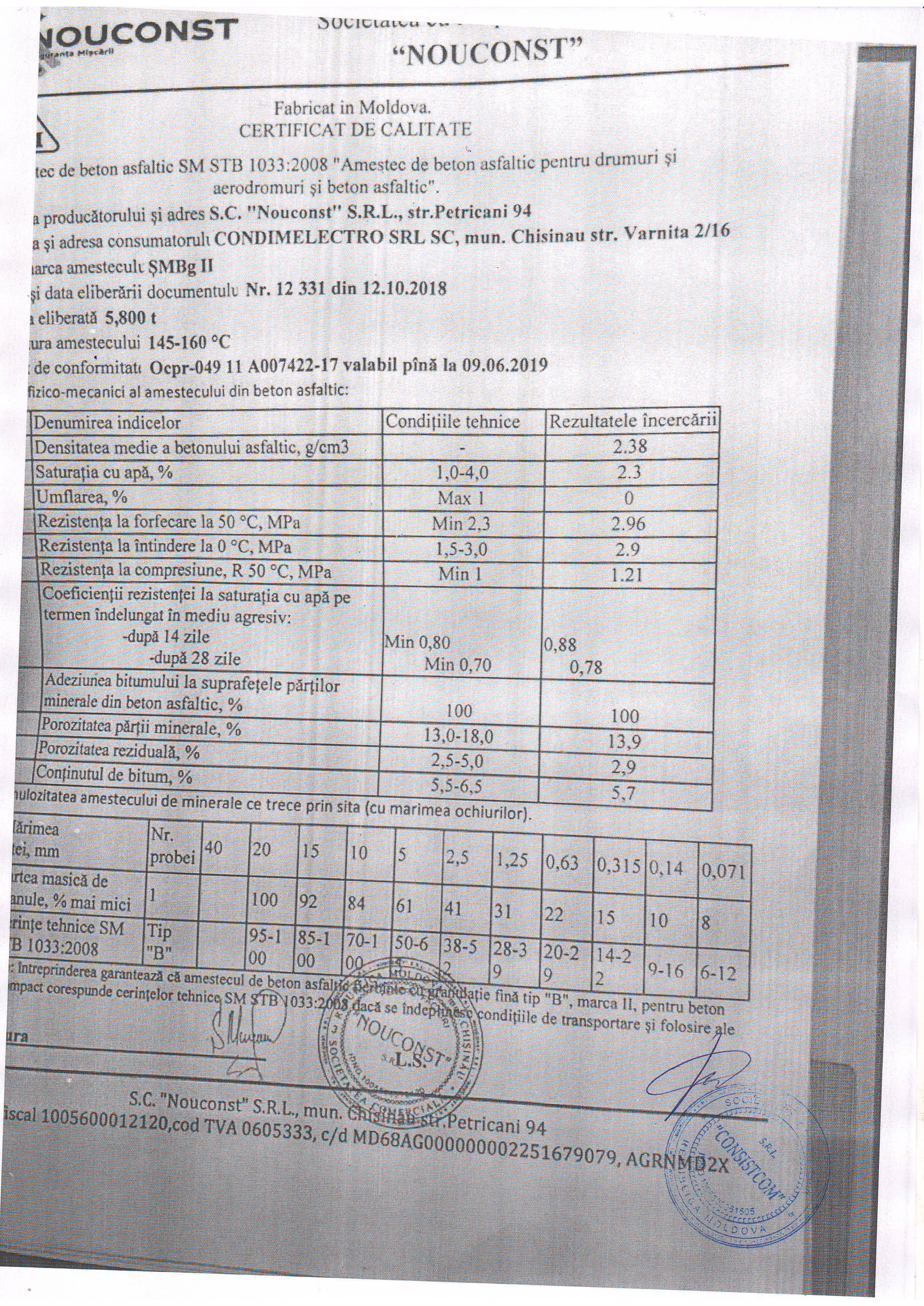 | 08/11/2018 14:00 | сканировать10003.jpg | Garanții | Asfaltarea suprafețelor și executarea a două piste de alergare | Certificat de calitate a marfii prime, eliberat de Organismul National de verificare | Romana |