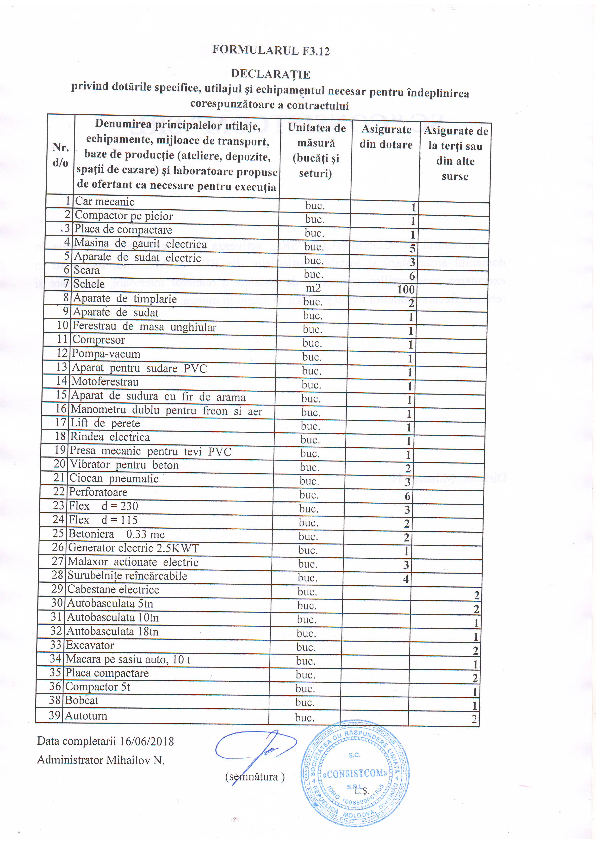 | 08/11/2018 14:00 | 12.utilaj.jpg | Garanții | Asfaltarea suprafețelor și executarea a două piste de alergare | Declaratia provind dotarea specifica , utilajul si echipamentul necesar pt indeplinirea corespunzatoare a contractului | Romana |