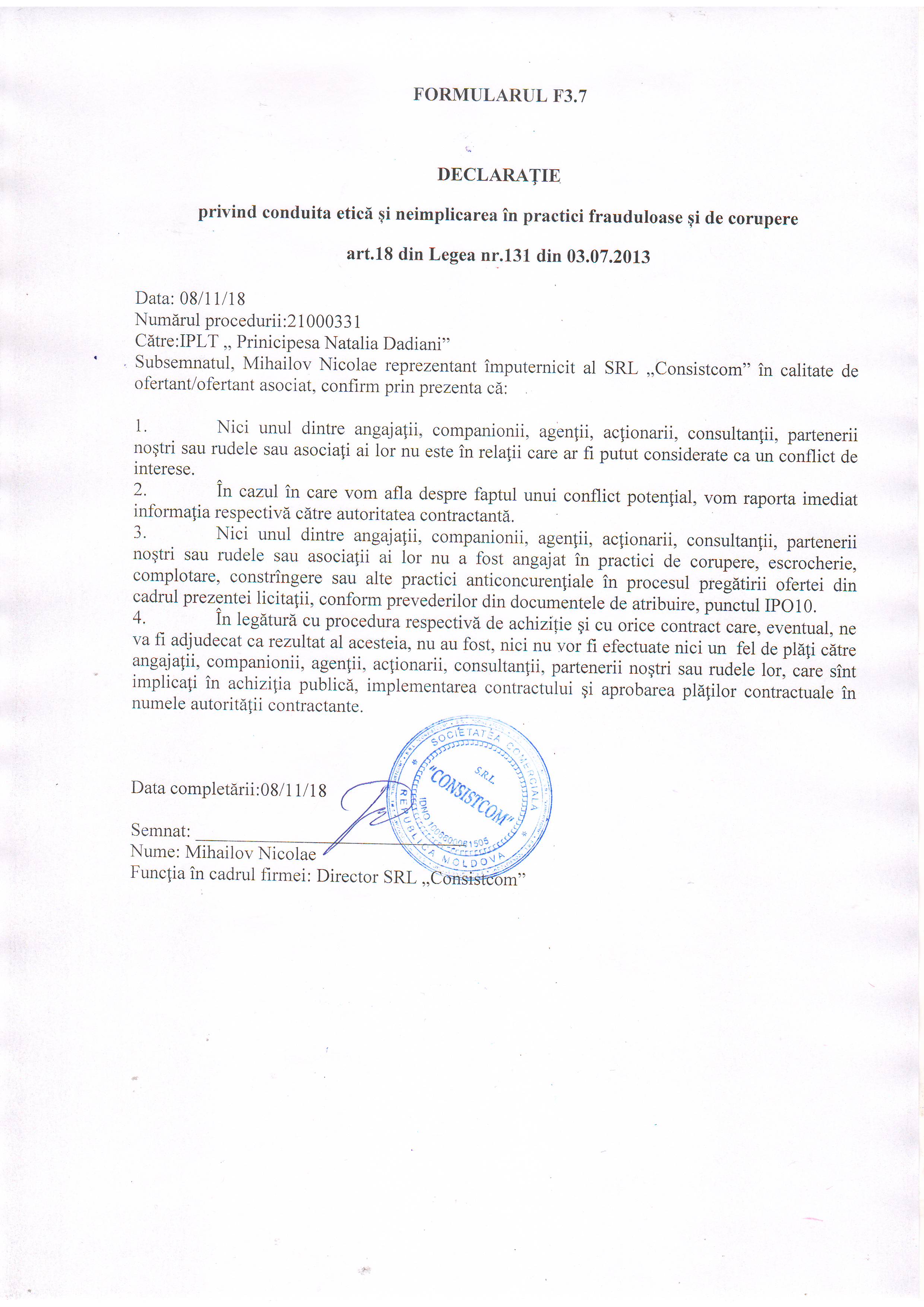 | 08/11/2018 14:00 | сканировать10002.jpg | Garanții | Asfaltarea suprafețelor și executarea a două piste de alergare | Declaratia privind conduita etica si neimplicarea in practici frauduloase | Romana |