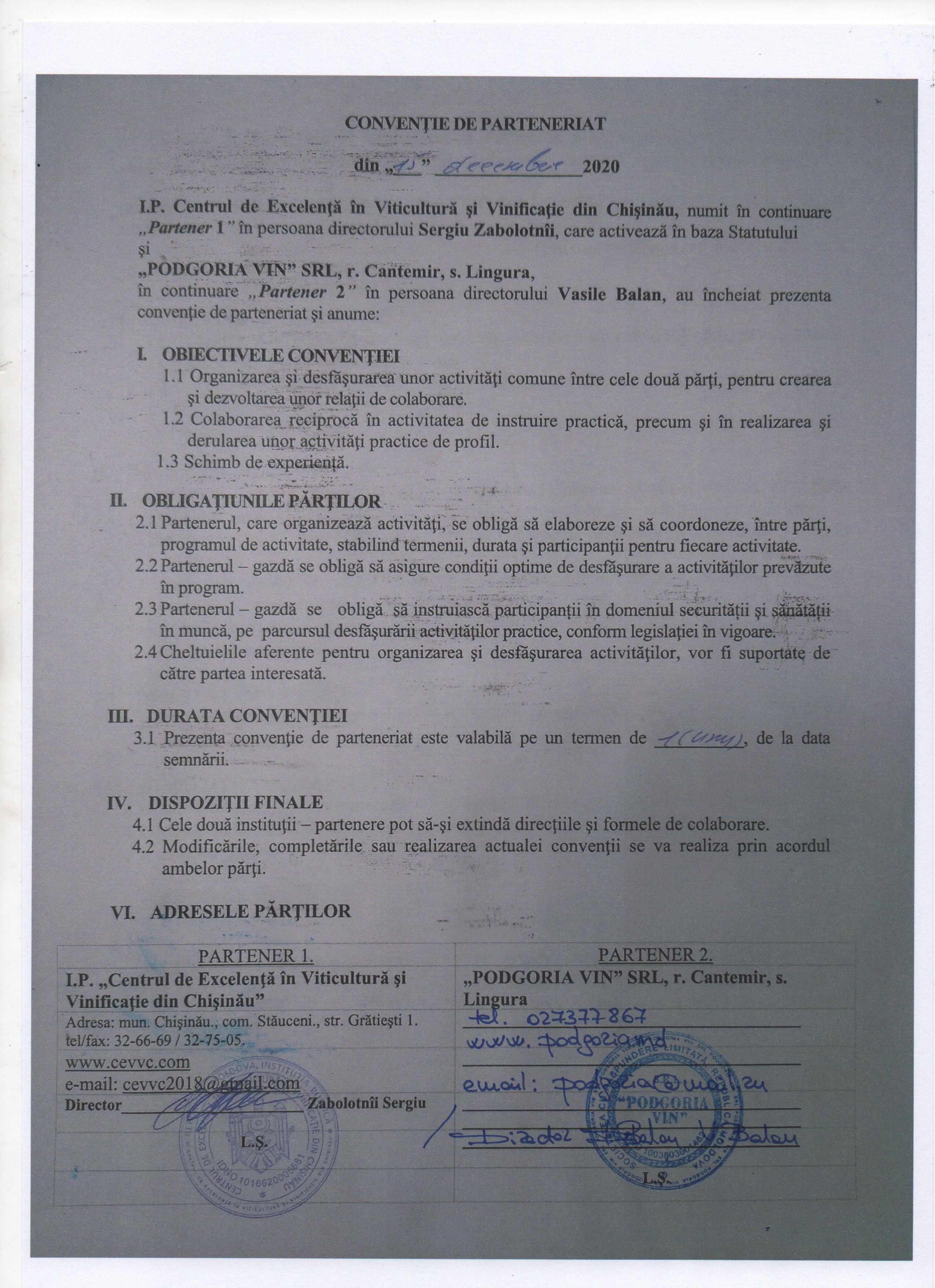 | 18/12/2020 17:00 | acord podgoria vin.jpg | Garanții | Servicii de consultanţă în domeniul producerii produselor vitivinicole cu indicații georafice și denumire de origine protejată | | Romana |