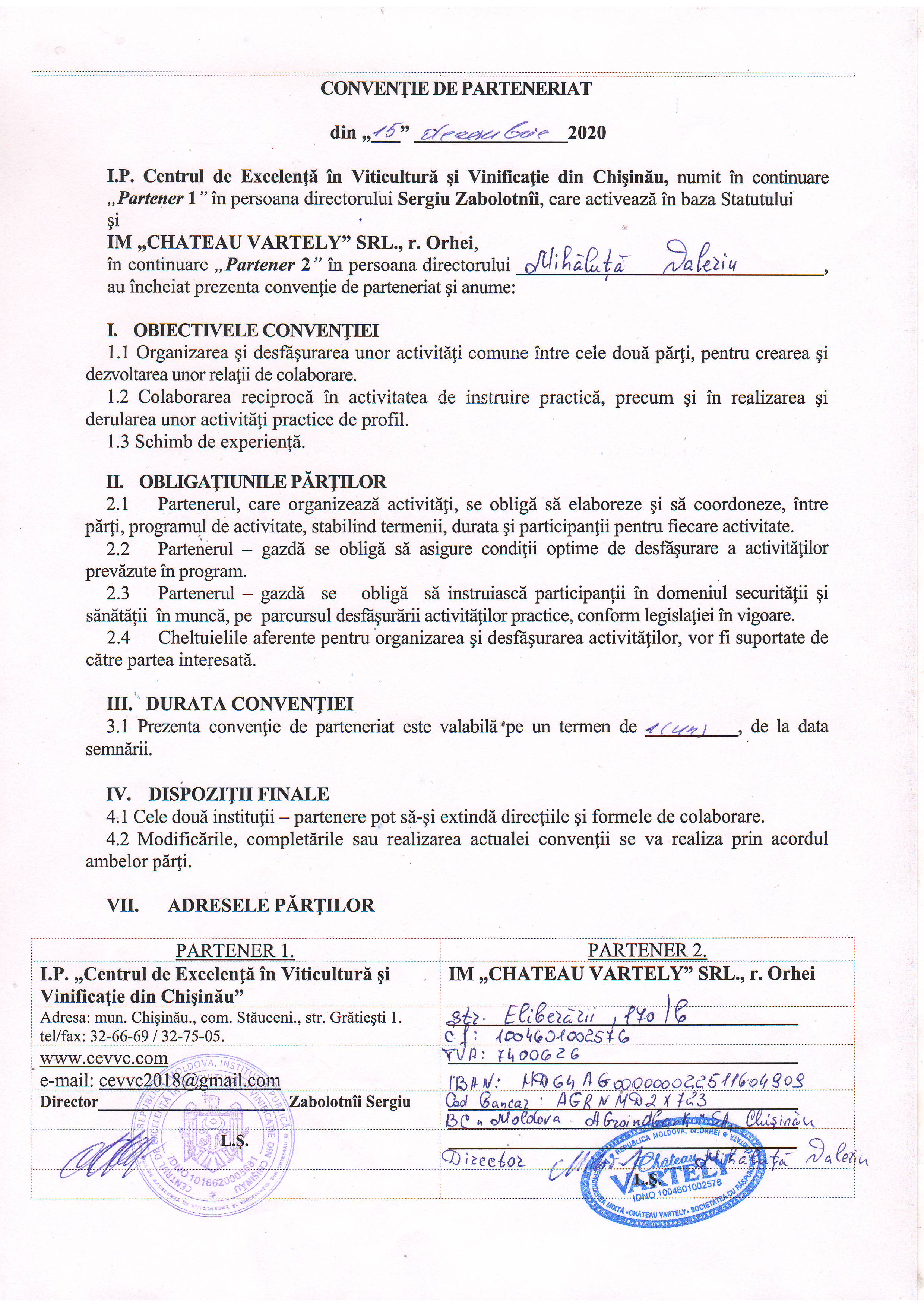 | 18/12/2020 17:00 | acord şato varteli.jpg | Garanții | Servicii de consultanţă în domeniul producerii produselor vitivinicole cu indicații georafice și denumire de origine protejată | | Romana |