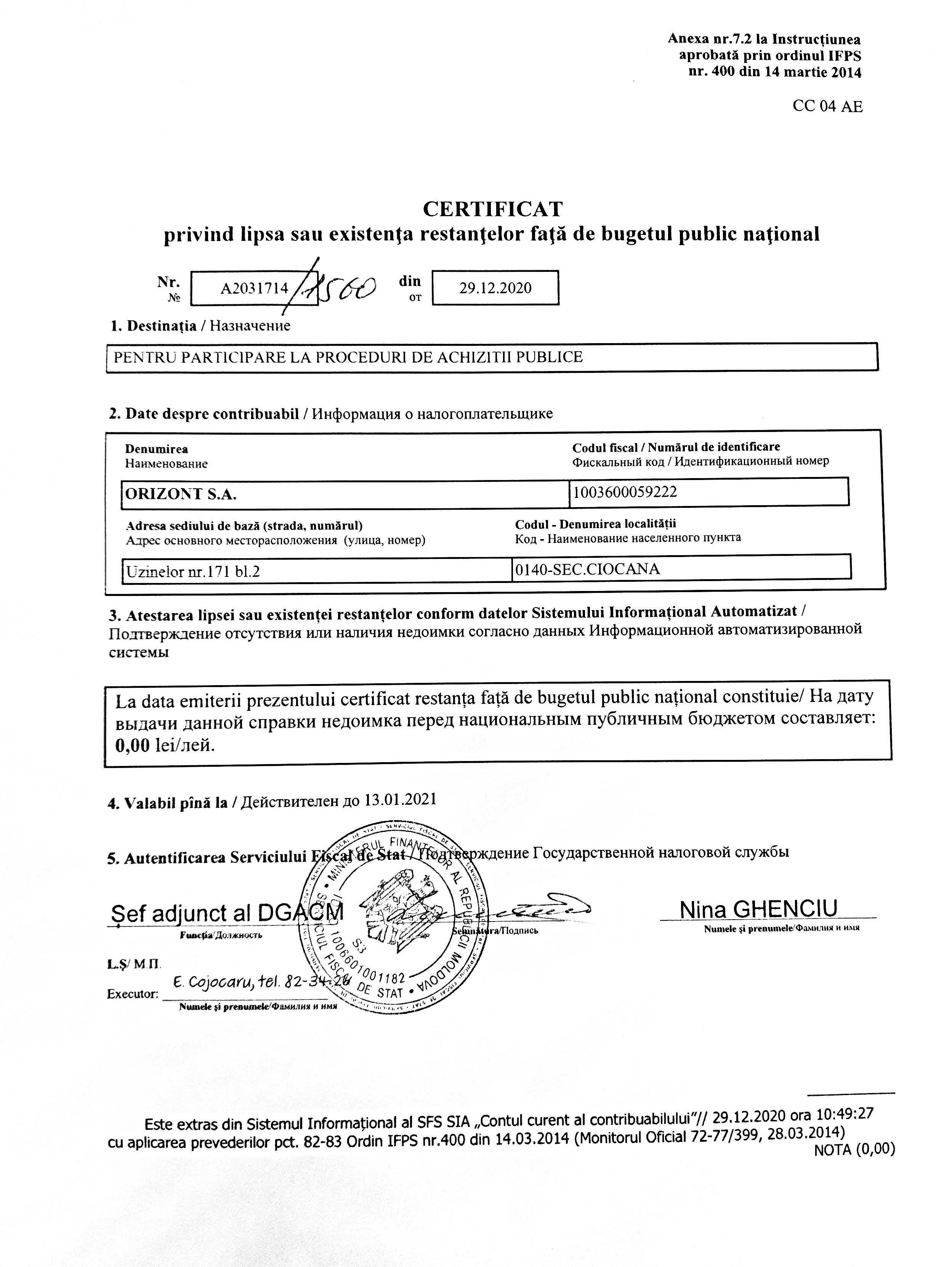 | 04/01/2021 10:34 | 08 certificat fisc.jpg | Doc. de calificare | Constructia retelelor exterioare de alimentare cu apa in s. Novosiolovca r-nul Taraclia. Etapa II, strazile №01/19-AE.S | 08 certificat fisc.jpg | Romana |