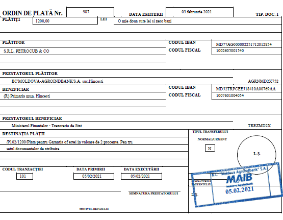 | 10/02/2021 09:00 | ordin de plata 1200.00 lei md.png | Garanții | Benzină | | Romana |