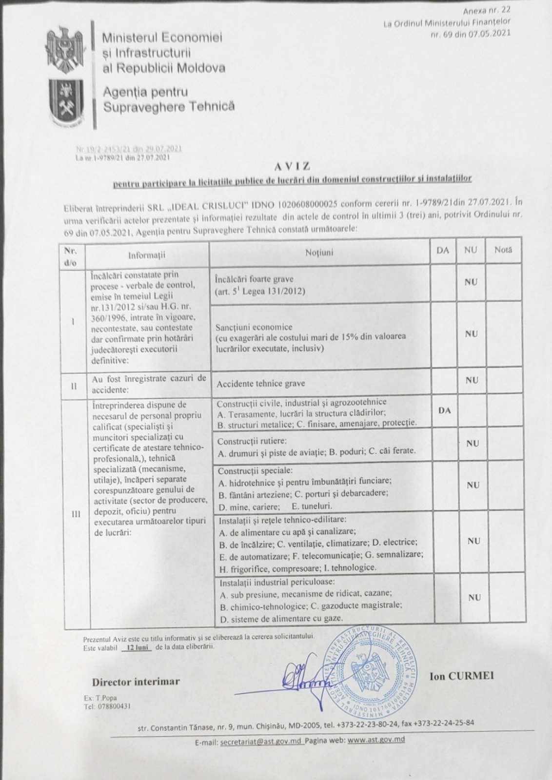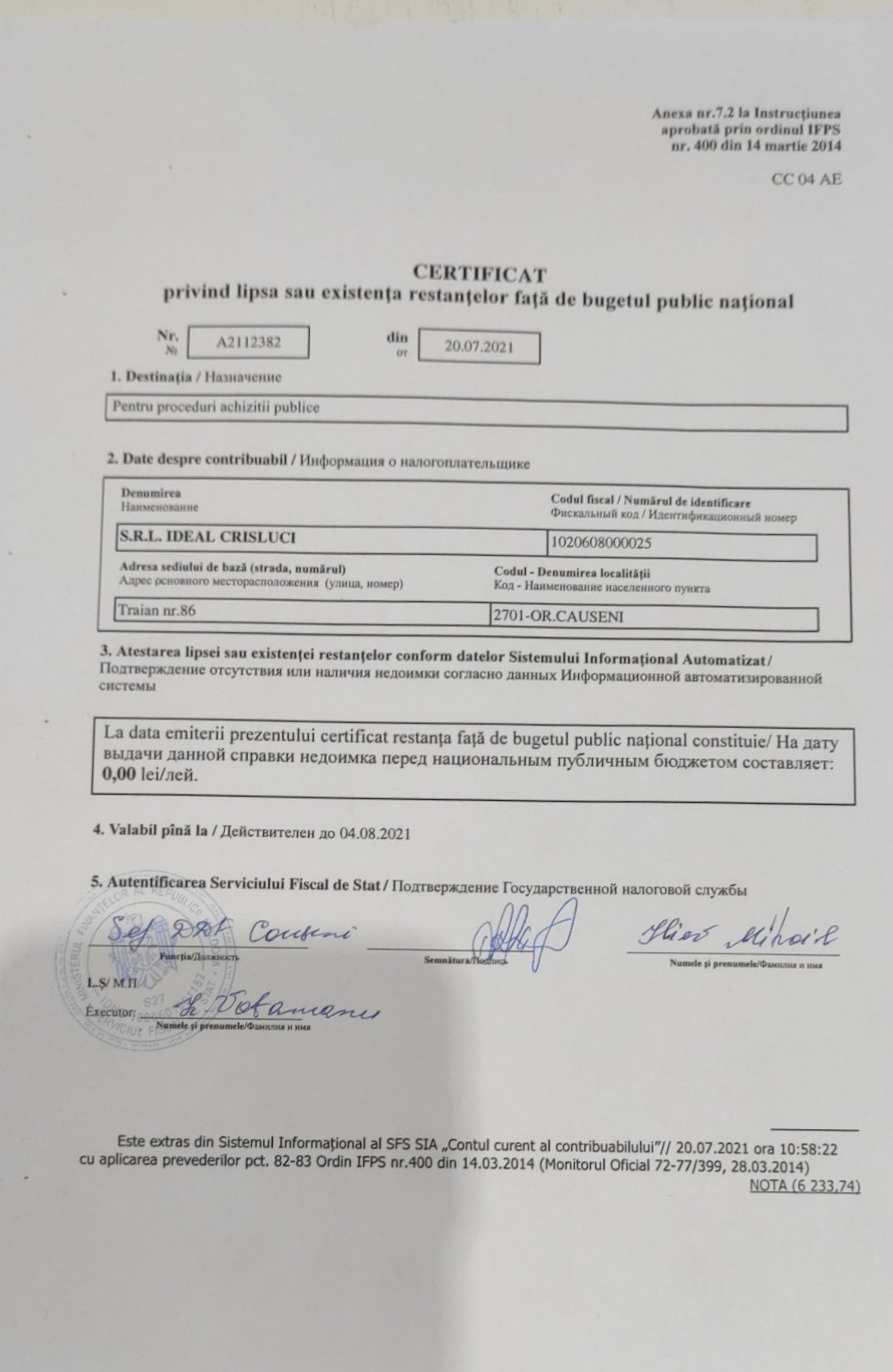 | 13/11/2021 15:30 | certificat privind lipsa sau existenta restantelor fata de bugetu; public national.jpg | Garanții | „Reparația capitală a trotuarului din s. Copanca adiacent drumului L581 Copanca-Crimenciuc-Slobozia-M5, r-nul Căușeni„ | - | Romana |