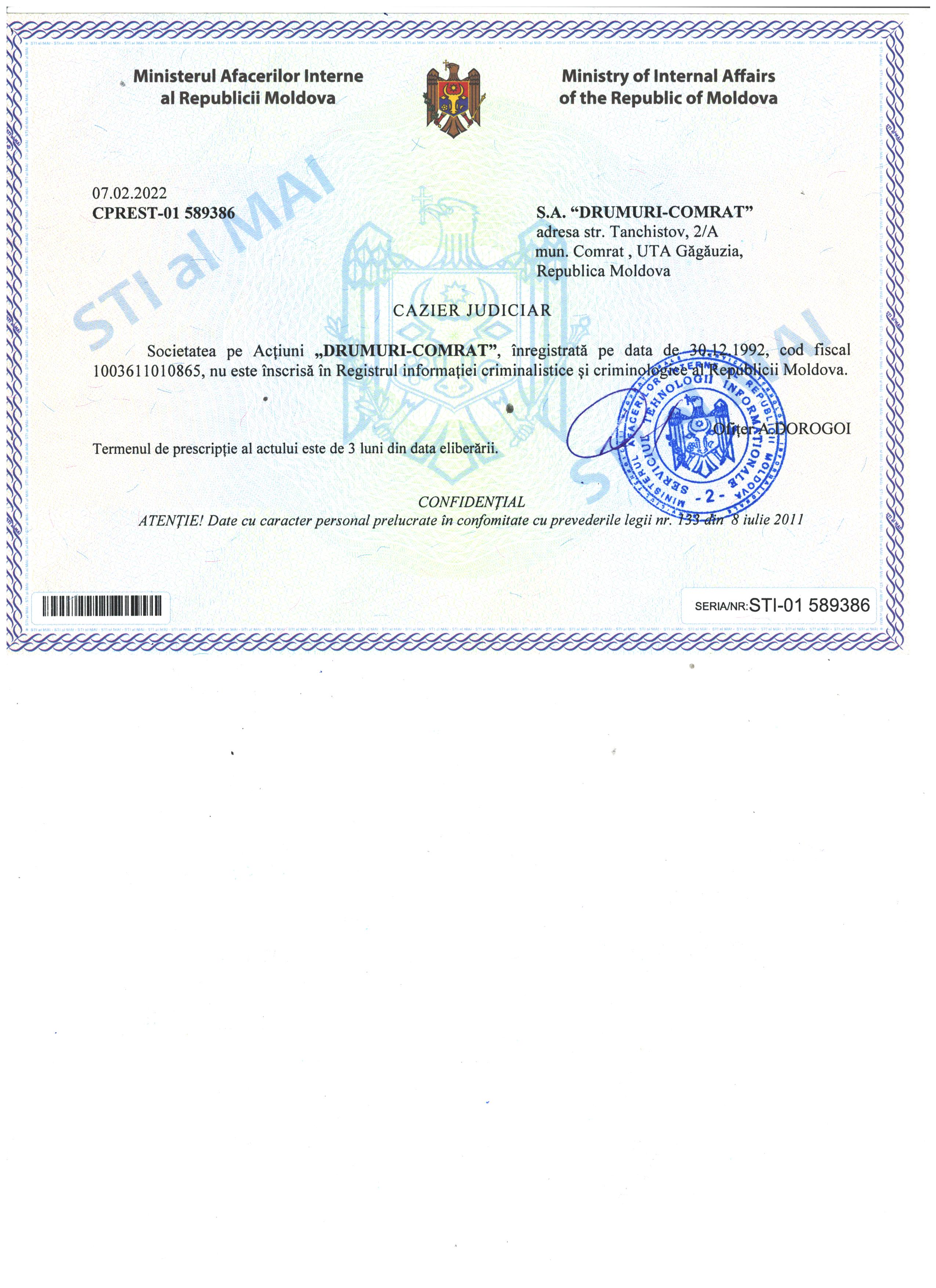 | 21/02/2022 10:00 | 15) cazier judiciar.jpg | Doc. de eligibilitate (DUAE) | Устройство дорожного покрытия из брусчатки улиц с.Копчак Чадыр-Лунгского р-на | - | Romana |