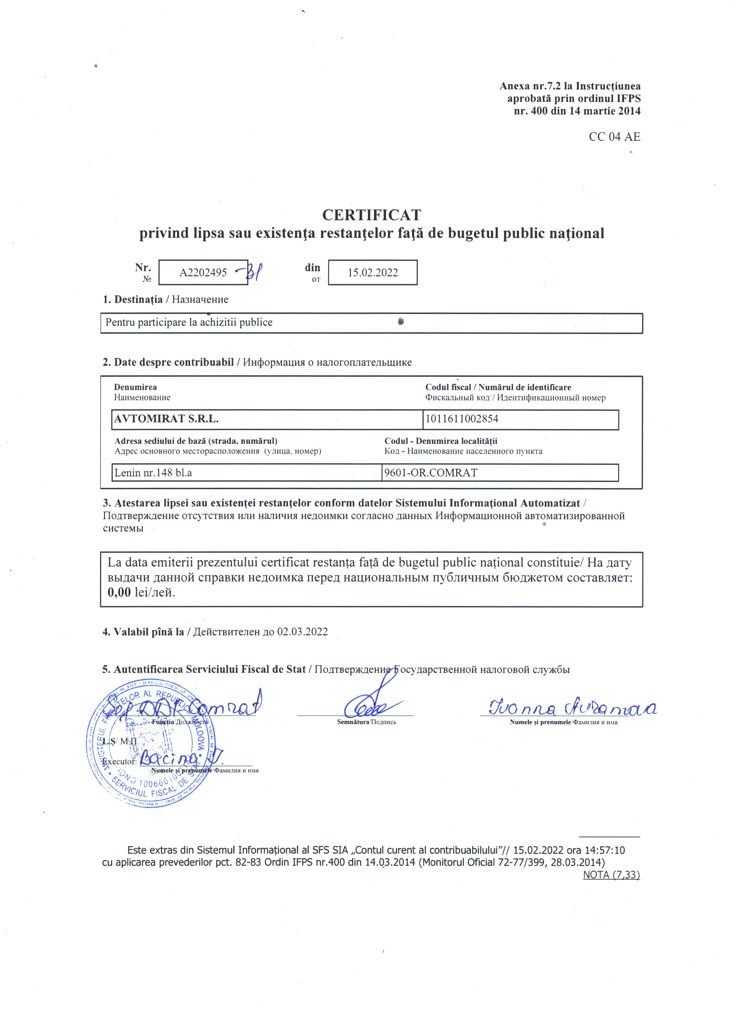 | 21/02/2022 10:00 | задолж. перед бюджетом автомир 001.jpg | Doc. de eligibilitate (DUAE) | Устройство дорожного покрытия из брусчатки улиц с.Копчак Чадыр-Лунгского р-на | - | Romana |