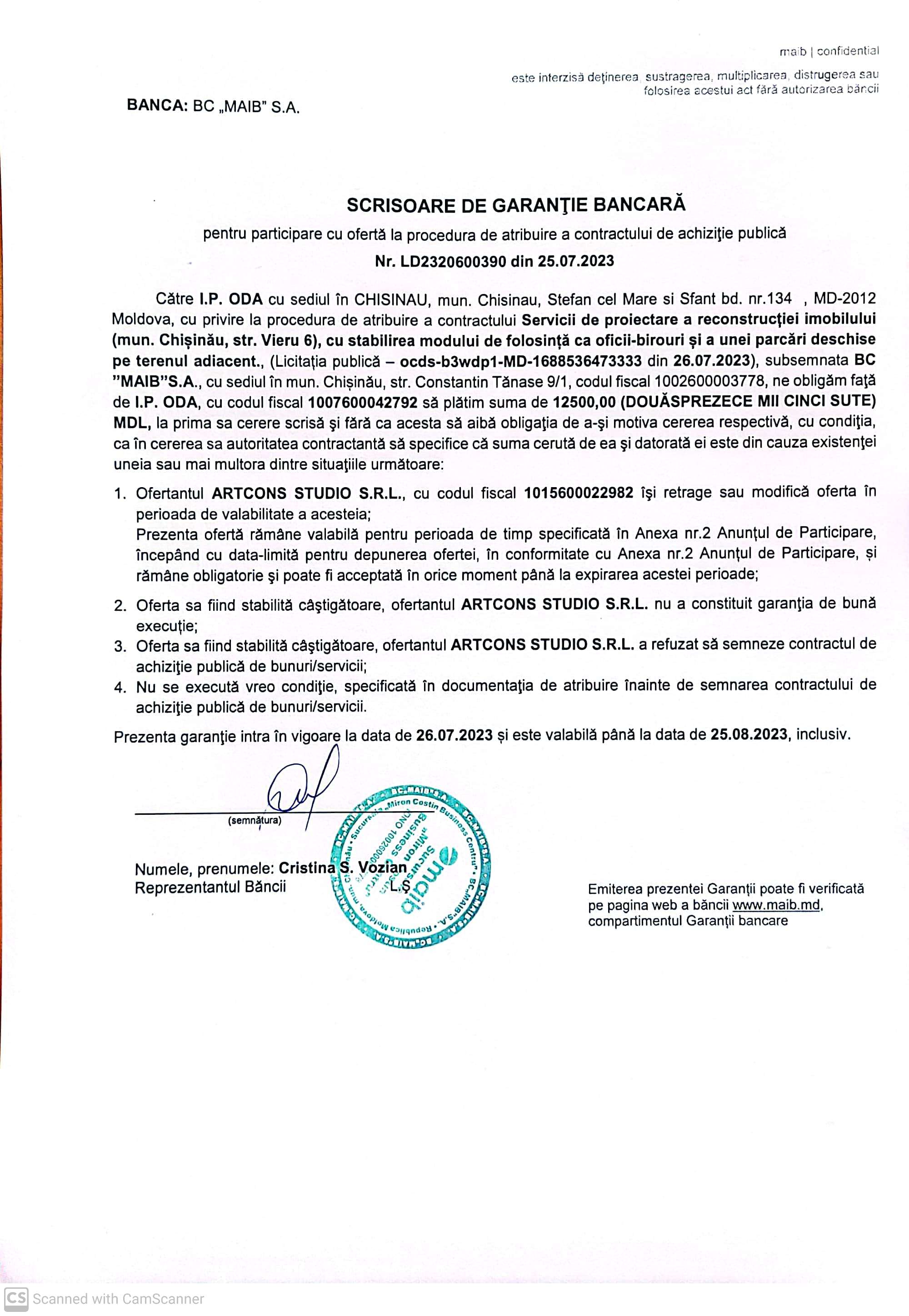 | 26/07/2023 09:00 | garantie bancara.jpg | Doc. de eligibilitate (DUAE) | Servicii de proiectare a reconstrucției imobilului (mun. Chișinău, str. Vieru 6), cu stabilirea modului de folosință ca oficii-birouri și a unei parcări deschise pe terenul adiacent | - | Romana |