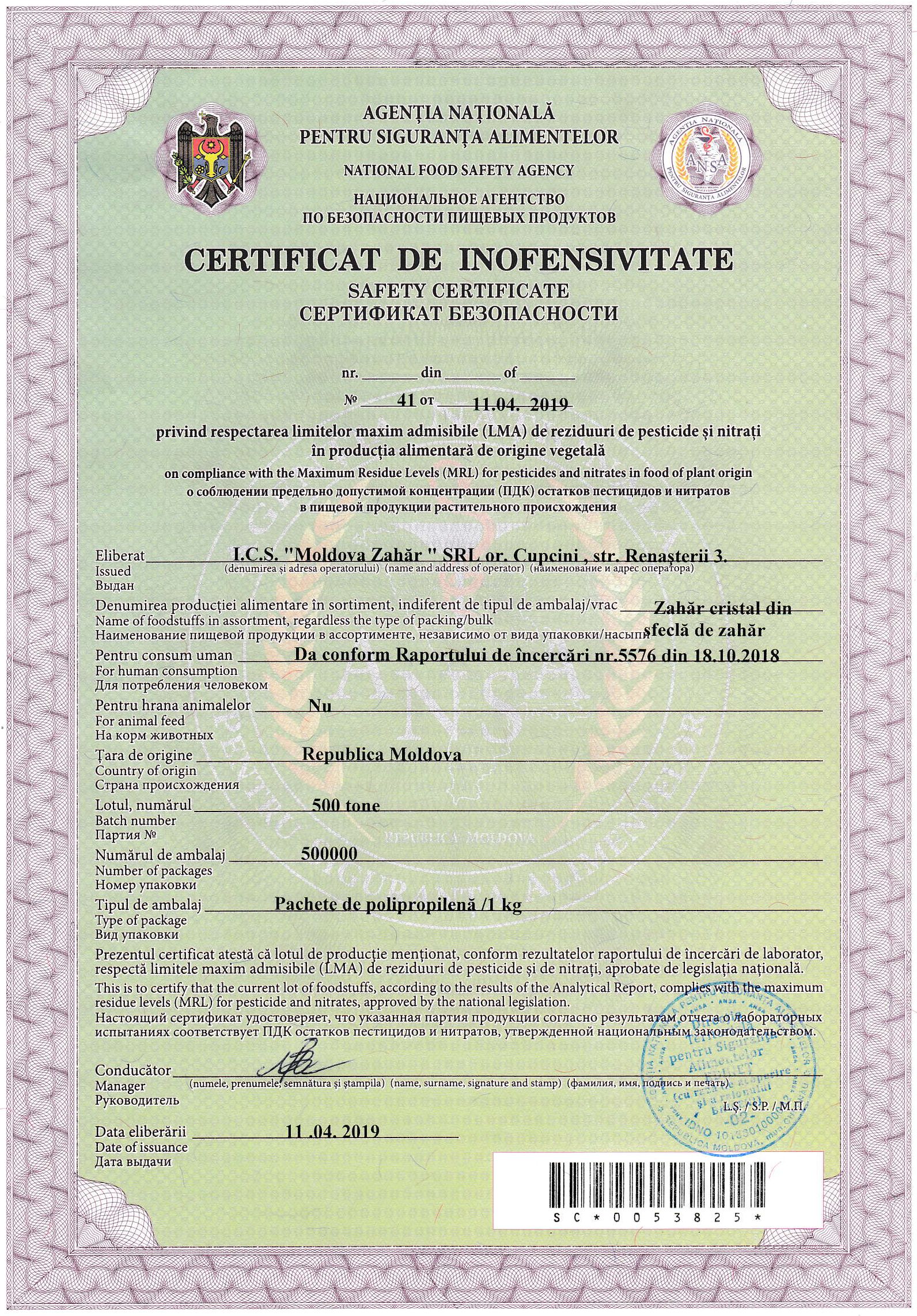 | 10/06/2019 12:00 | certificat inofensivitate zahar 1kg 2019.semnat.jpg | Garanții | fileu de pui – produs autohton | | Romana |