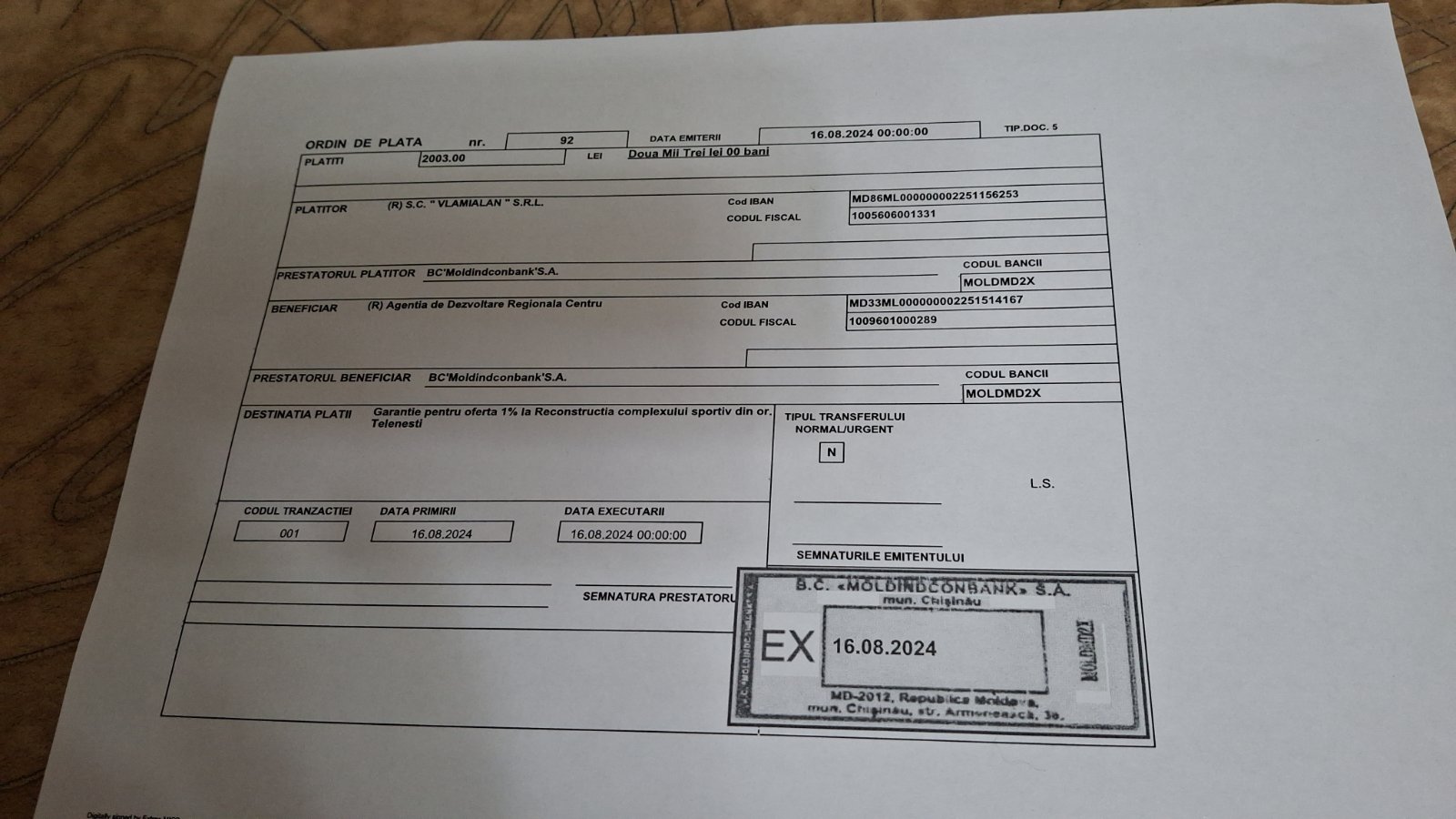 | 20/08/2024 17:00 | dovada achitarii garantiei.jpg | Doc. de eligibilitate (DUAE) | Servicii de supraveghere tehnica a lucrărilor Reconstrucția Complexului sportiv pe imobilul cu nr. cadastral 8901217,010, din or.Telenești, str. Ștefan cel Mare și Sfînt, 33 | Garanția pentru ofertă | Romana |