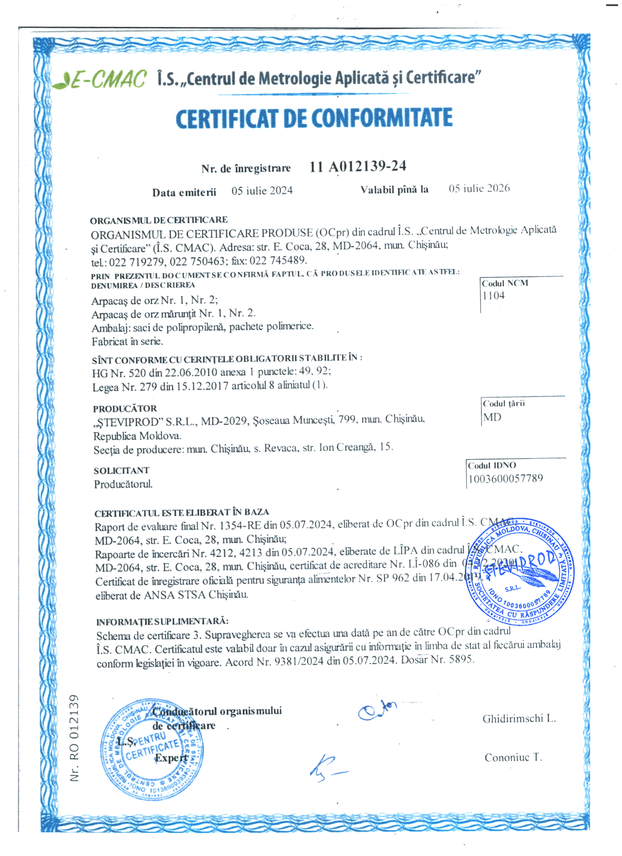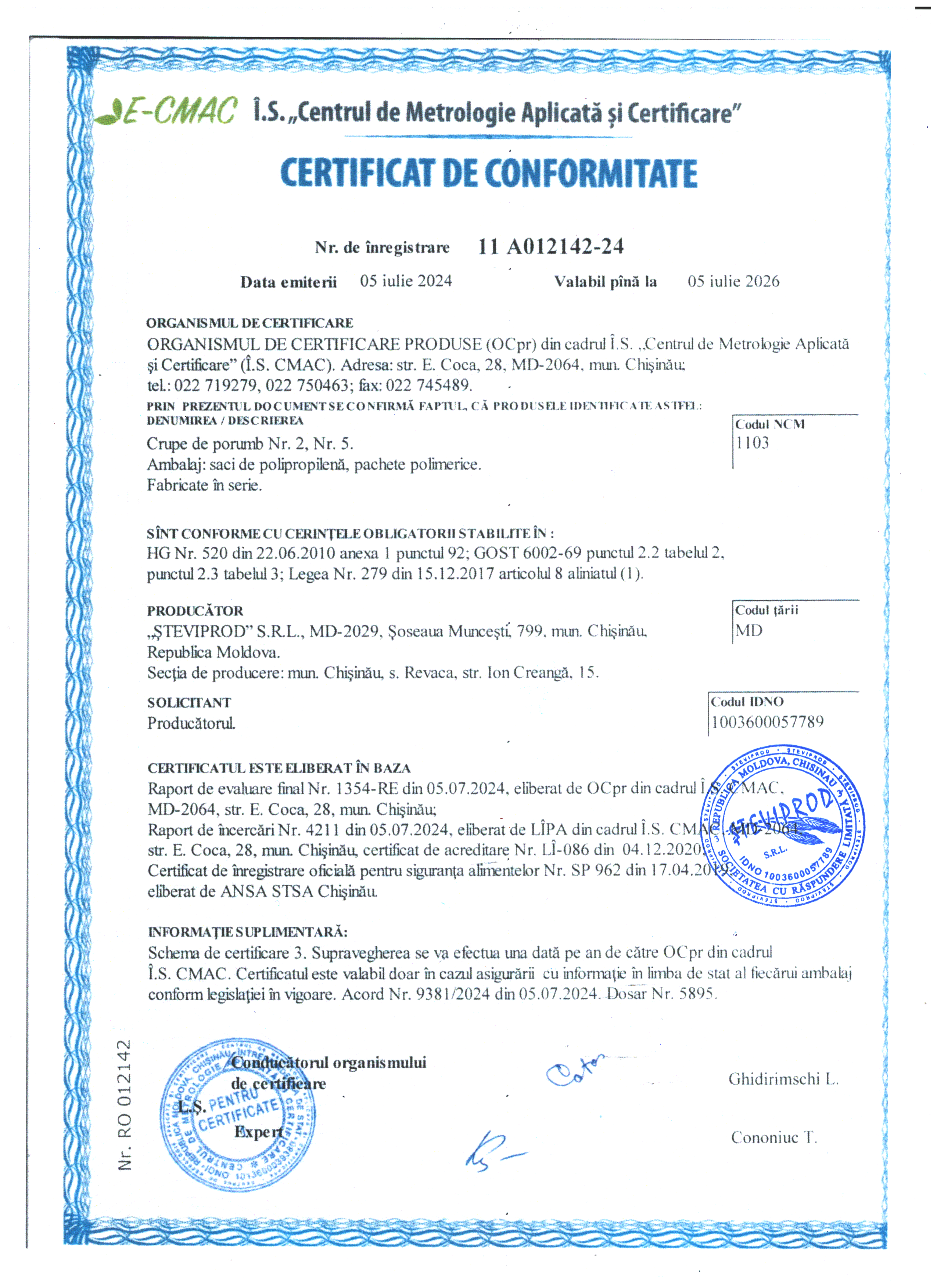 Crupe de porumb în ambalaj de 1 kg. În ambalaj de 1 kg, calitatea superioara Malai Extra, HG 520 din 22.06.2010, Orele 8-15 o data în lună