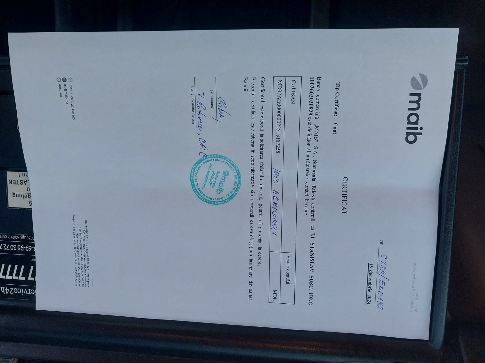 | 26/12/2024 15:00 | certificat bancar.jpg | Doc. de eligibilitate (DUAE) | Servicii de transport rutier specializat de pasageri, dest. s.Soltoaia, s.Făgădău | -CERTIFICAT BANCAR | Romana |