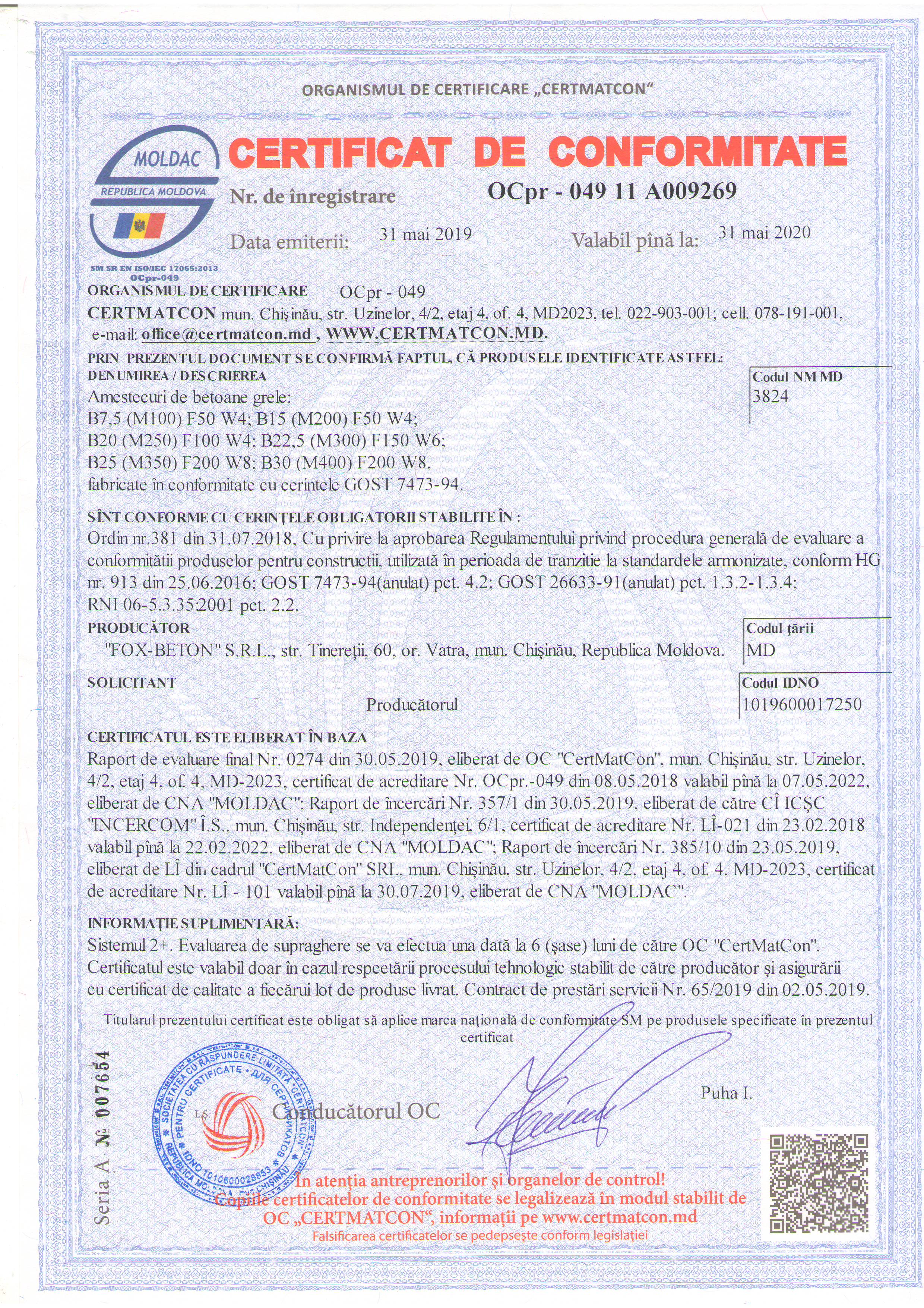 | 26/07/2019 15:24 | изображение0002.jpg | Doc. de calificare | materiale de constructie – Beton preparat , cu livrare la locul destinației - marca 300 cu prundiș concasat | certificat de conformitate | Romana |