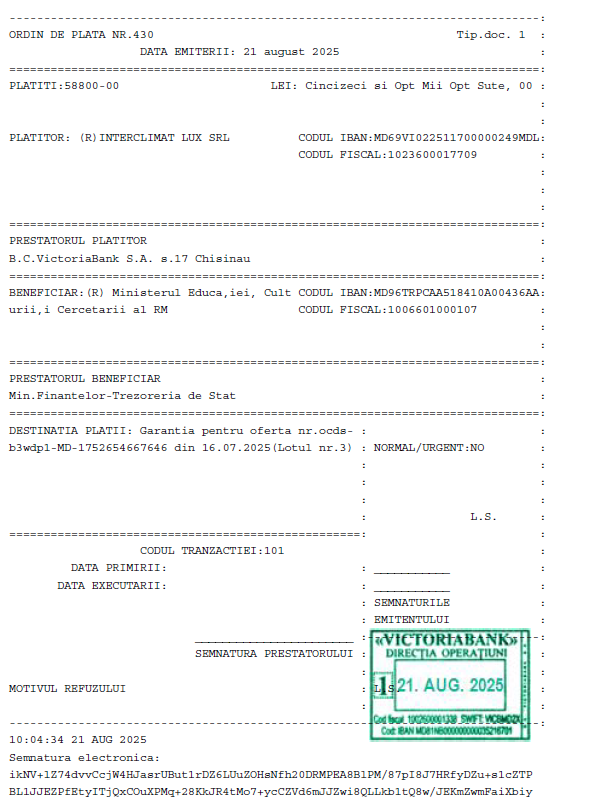 | 25/08/2025 14:02 | dispoziție de plată nr.430.png | Propunere financiară | LOT 3: Depozitare frigorifică și echipamente auxiliare de păstrare | - | Romana |