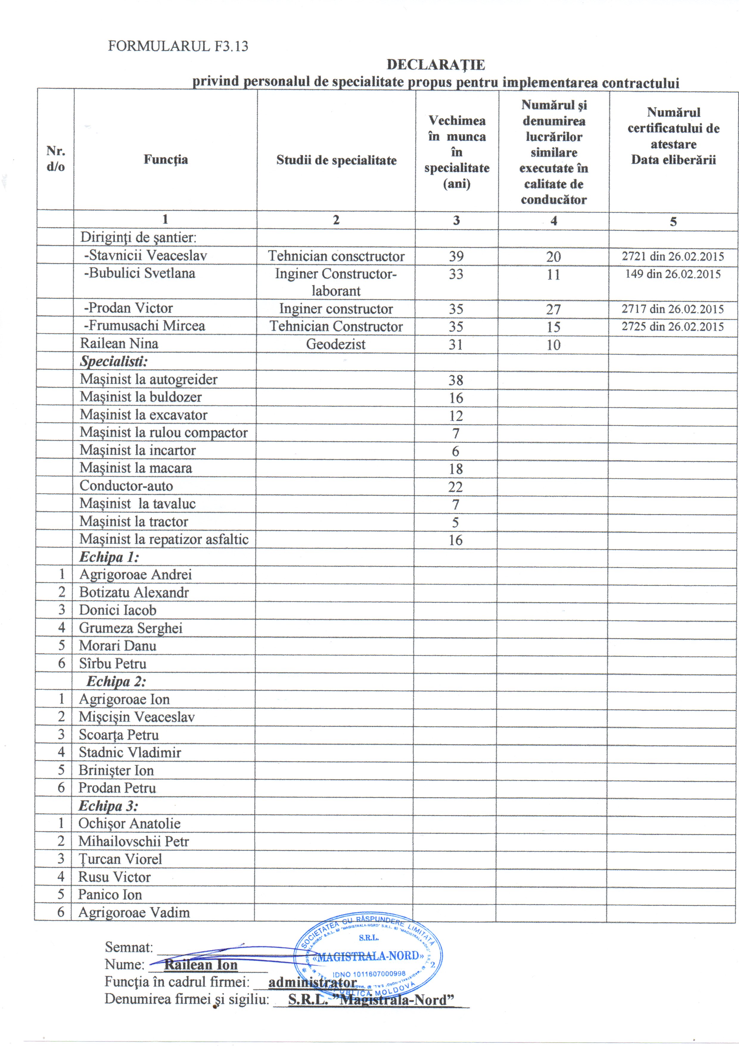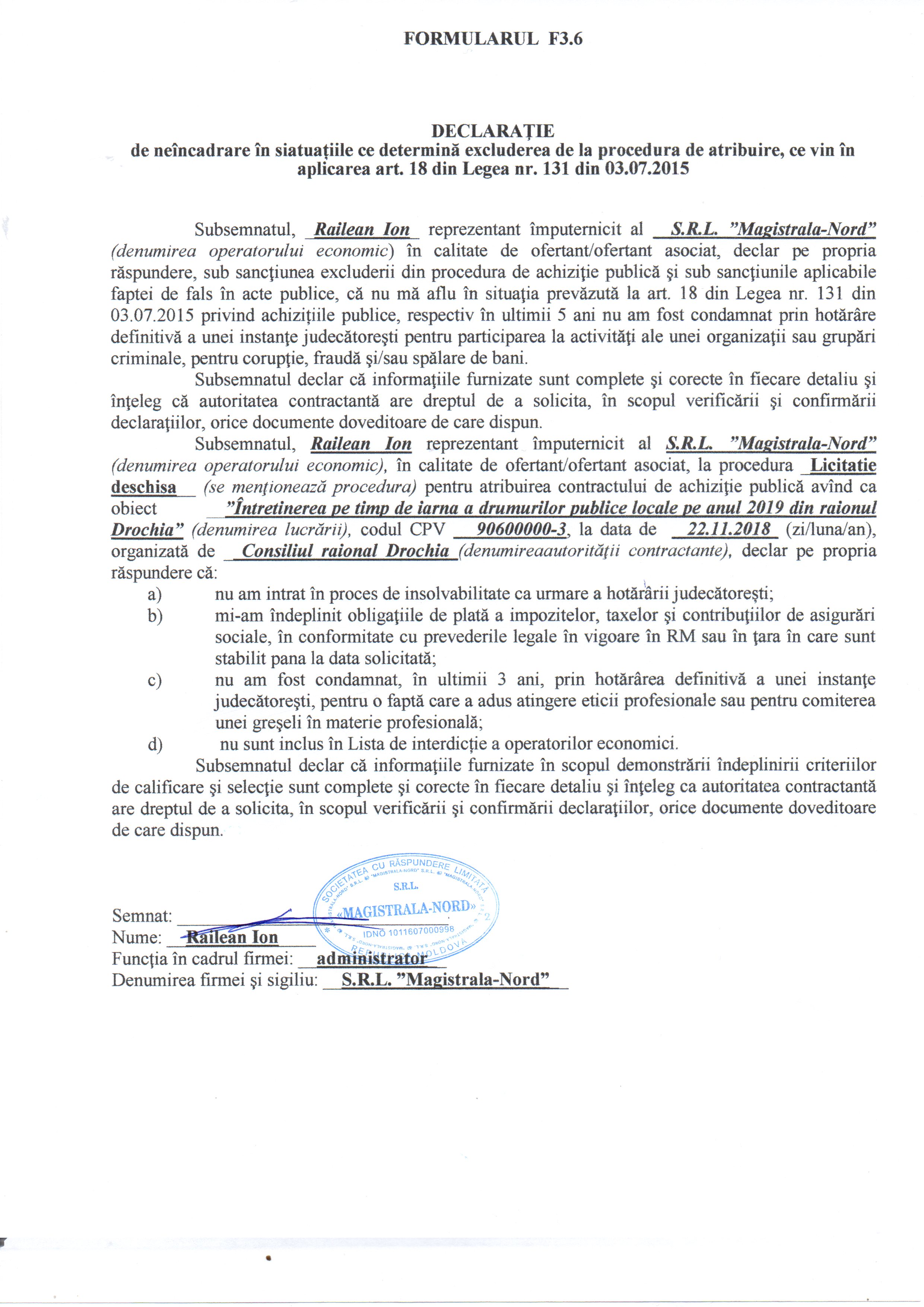 | 22/11/2018 14:00 | declaratie prind personalul.jpg | Doc. de calificare | Întreţinerea pe timp de iarnă a drumurilor publice locale pe anul 2019 din raionul Drochia | | Romana |