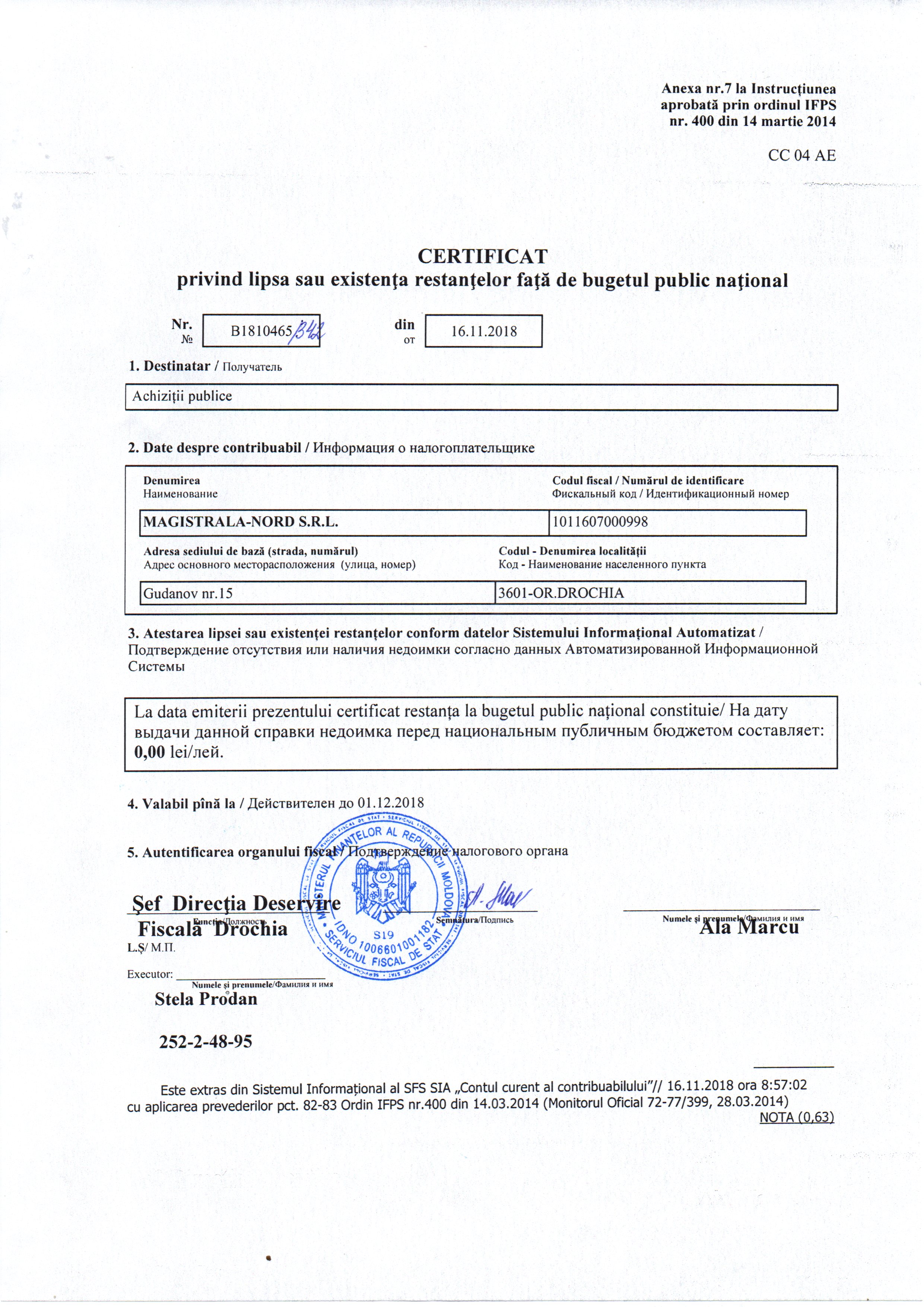 | 22/11/2018 14:00 | certificat privind lipsa datoriilor.jpg | Garanții | Întreţinerea pe timp de iarnă a drumurilor publice locale pe anul 2019 din raionul Drochia | | Romana |